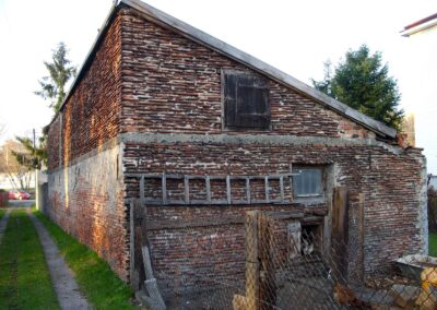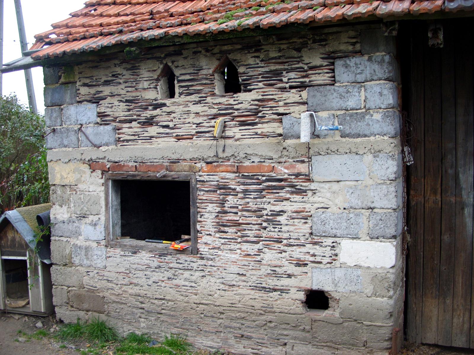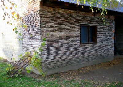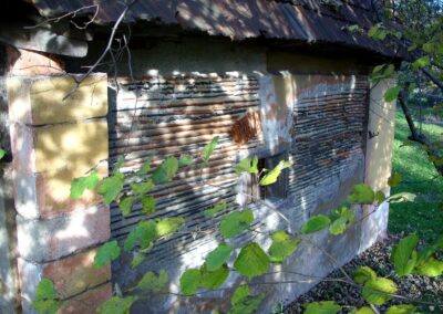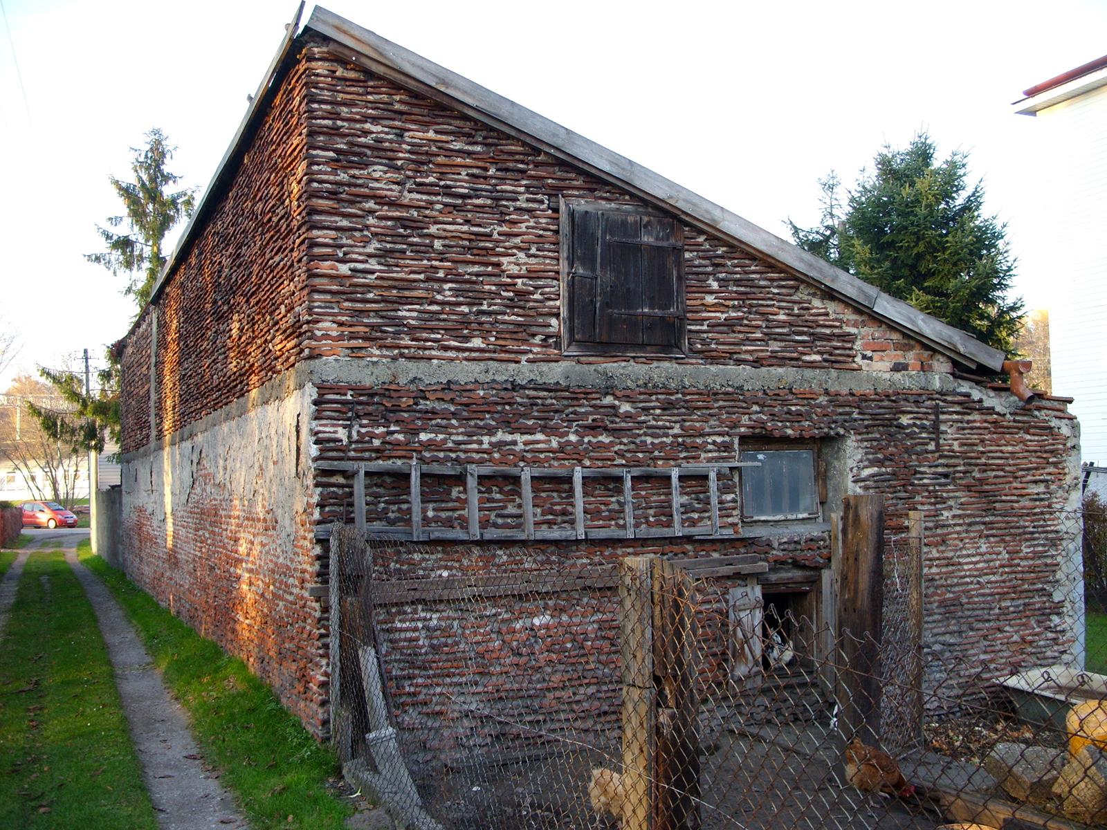 Dziś już trudno wskazać który z obiektów zbudowano jako pierwszy, jednak z obserwacji wynika, że najstarsze są małe budynki typu chlewik, kurnik, komórka, a użyte do ich budowy dachówki pochodzą z rozbiórki zniszczonych wojną domów. Dachówki nie są wydajnym budulcem i często stosowano je w połączeniu z cegłami i pustakami, materiały spoinowano zaprawą wapienną, cementową, a niekiedy lepiszczem glinianym. Wykorzystywano też gąsiory, które scementowane służyły za rury drenarskie.