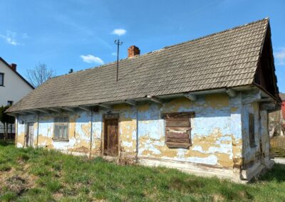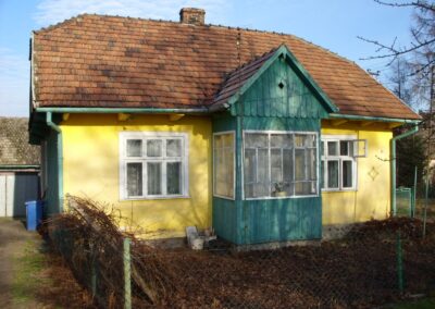 Chaty chałupnicze budowano dla rodzin bezrolnych lub trudniących się rzemiosłem i chata taka miała wejście główne i sień (przedsionek) z boku ściany frontowej i jedną izbę z przechodnią kuchnią (czasem też warsztacik, komórkę, spiżarkę bądź chlewik).