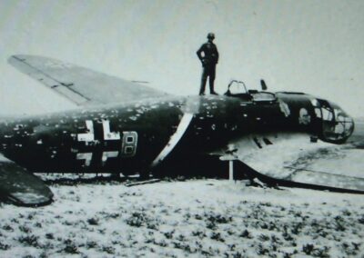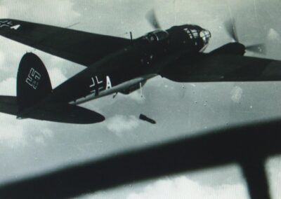 Trójka bombowców przedarła się nad składnicę, lecz tam też natrafiły na obronę przeciwlotniczą. Na zdjęciu LiDAR widać, że dwa bombowce zrzuciły po 5 bomb, natomiast trzeci tylko 2 w dużej odległości od siebie, najwyraźniej był w poważnych tarapatach; wszystkie bomby chybiły! Pozostałe He 111 uwikłane w walkę powietrzną nie miały możliwości wykonania zadania.